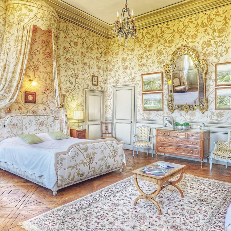 The Oval Room takes its name from its rigorously oval shape that marries the roundness of the south facade of the castle. It was formerly occupied by the Marquise Hélène de Champagné as well as the previous owners of the castle. A blue fabric highlights this unique room. A large bed, a large mirror, a pretty fireplace and period furniture complete this beautiful decor. The perspective of the French garden spreads under the windows, in the distance, the town of Craon whose noises are not perceived…