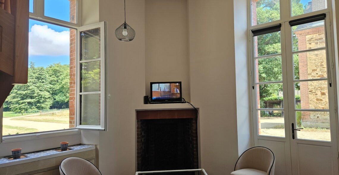 - A living room – dining room with an equipped kitchen – TV – view on the park and the château