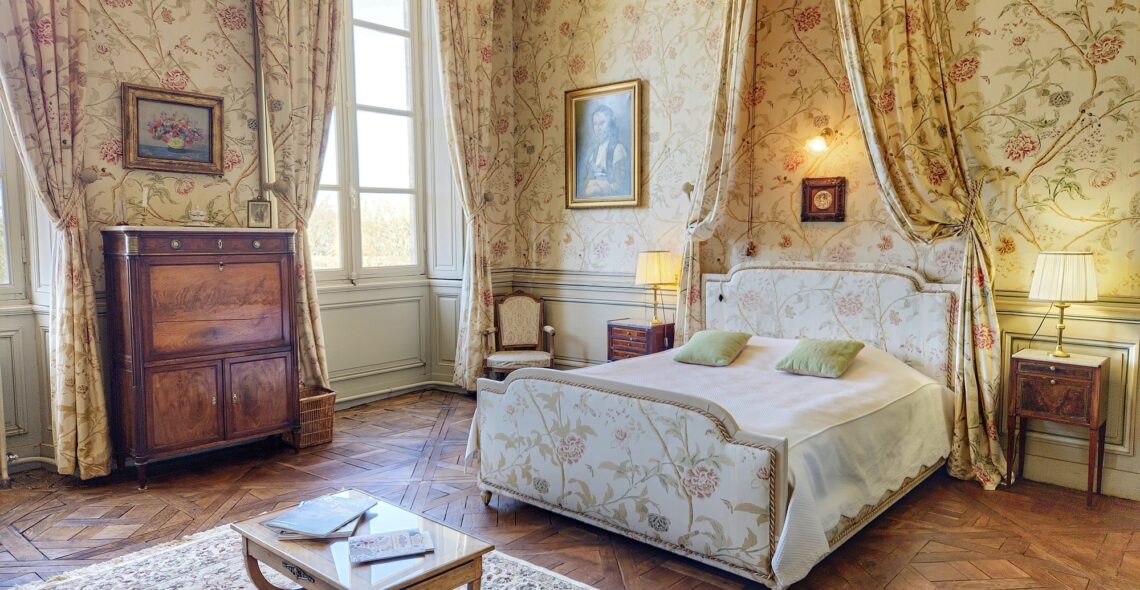 A la fois grandiose et intime, cette chambre princière aux tons poudrés avec son lit à baldaquin et son mobilier d’époque est sans doute la plus « XVIIIe » du château de Craon, et rappelle indéniablement le goût de Marie-Antoinette. La vue sur le jardin à la française renforce cette impression d’être au cœur du petit Versailles mayennais.