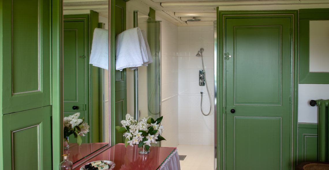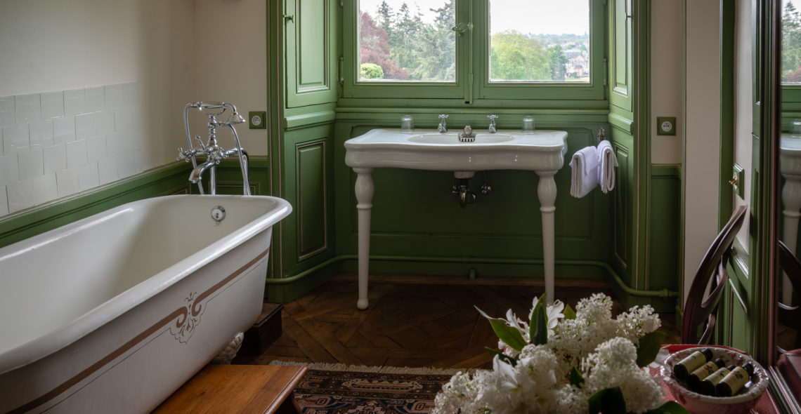 La salle de bain bénéficie d’une grande baignoire ancienne à pieds de lion et sacrifie à la modernité avec la présence d’une douche, et offre une vue sur le jardin à la française.