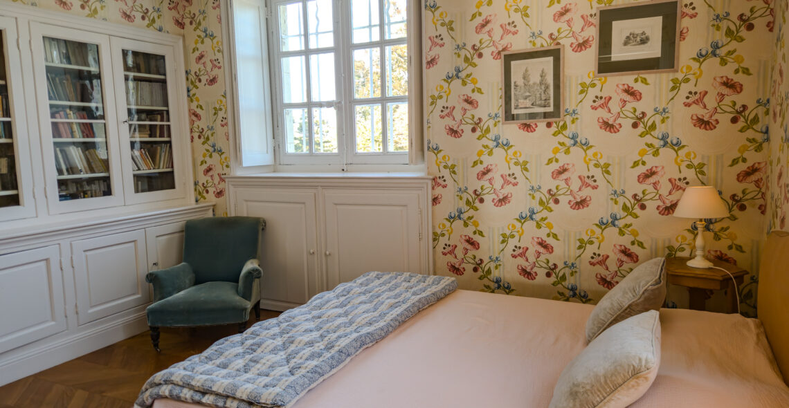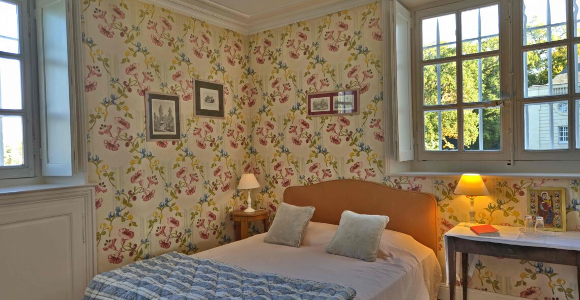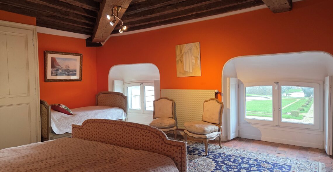 Ses fenêtres ouvrent sur le jardin à la française et le parc à l’anglaise entourant le château.