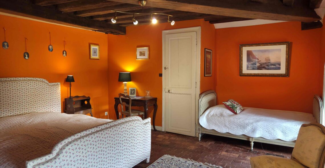 • Chambre Orange : 1 lit double (160) + 1 lit simple + salle de bain privative (douche, lavabo)