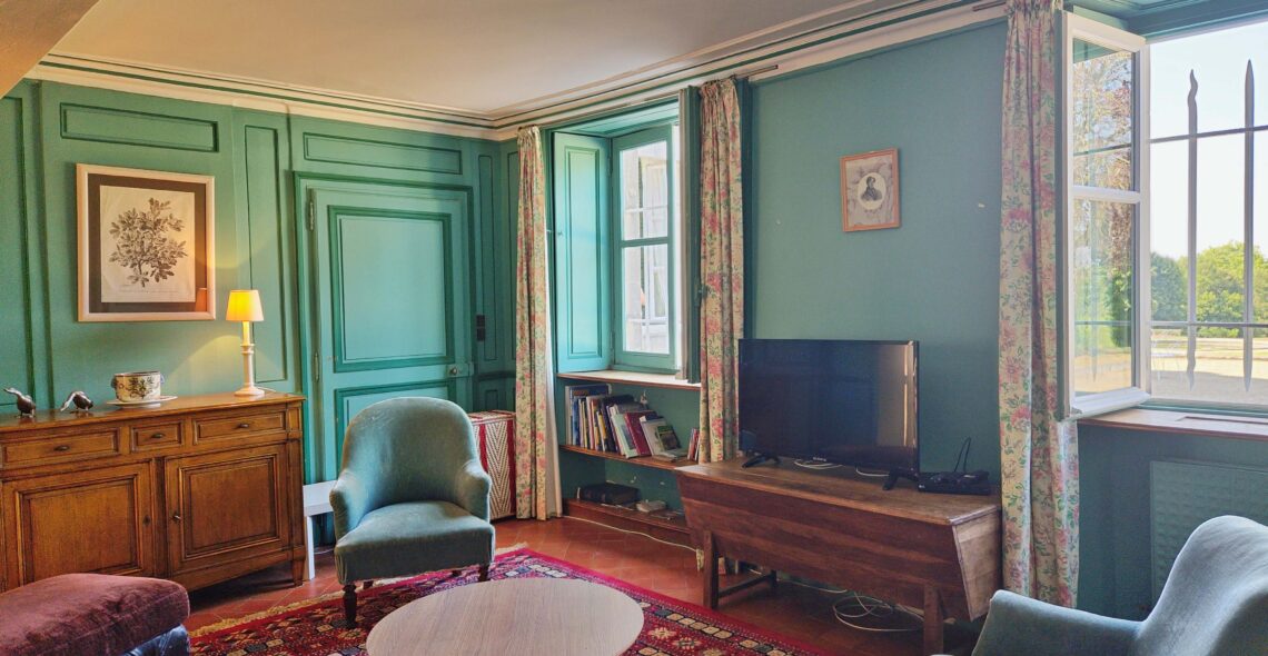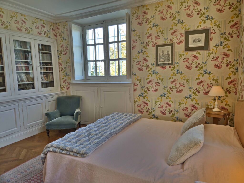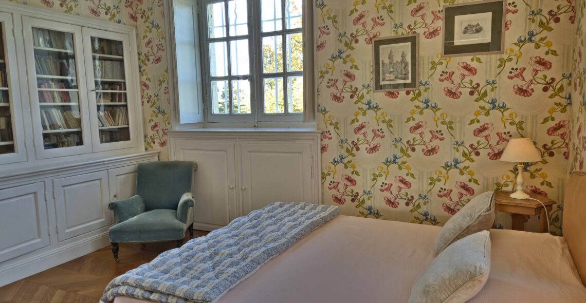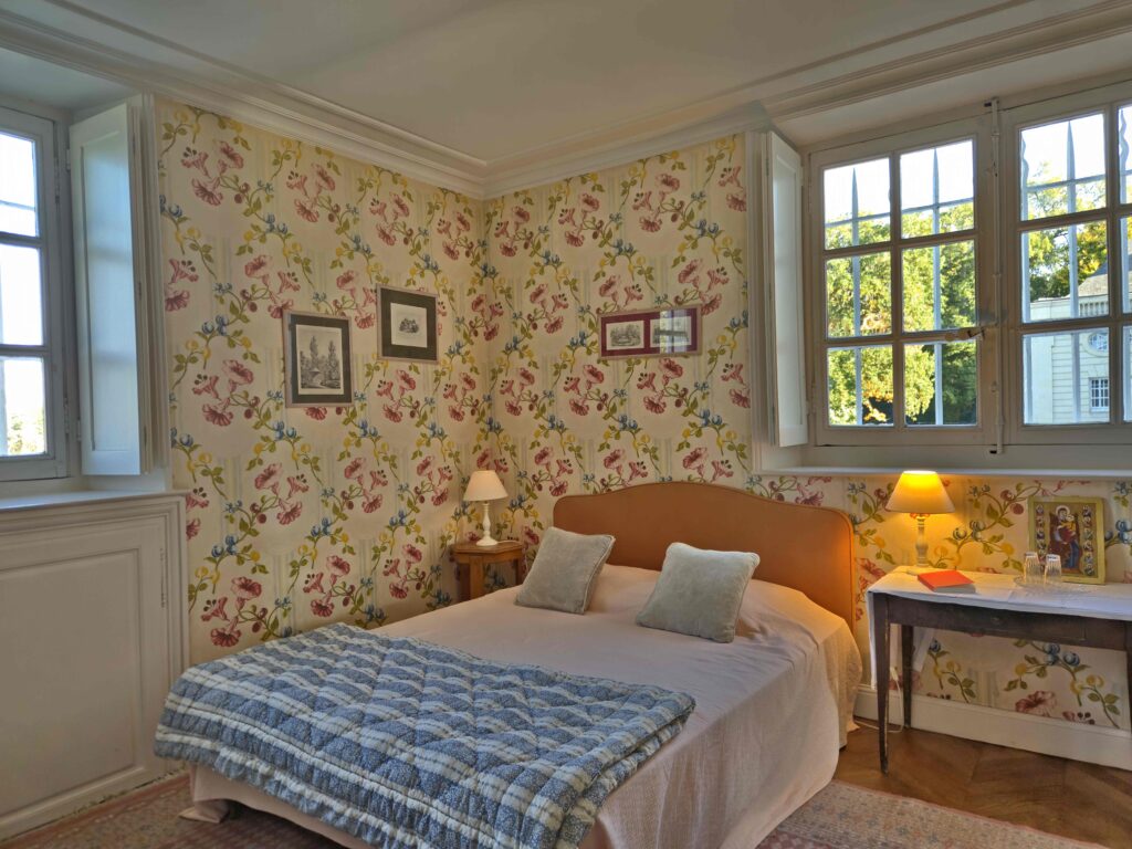 Ses fenêtres ouvrent sur le jardin à la française et le parc à l’anglaise entourant le château.